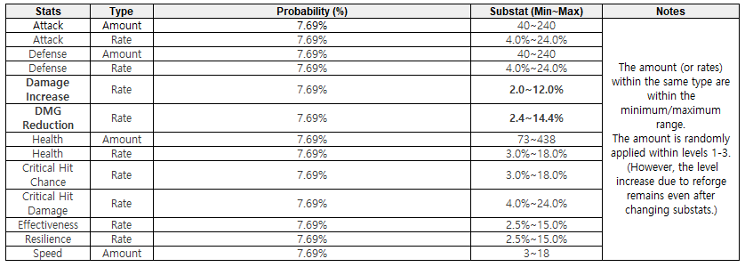 - When adding a substat by reforging, the probability will be 1/N, excluding the existing substat.