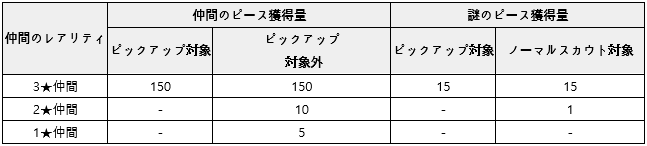 - 仲間を重複して獲得した際のピース獲得量は、下記表をご確認ください。