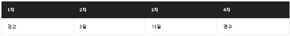 9. 이용 제한 정책 9.1 용어의 정의 1) 채팅 제한: 지정된 기간 동안 모든 채팅 기능이 제한됩니다. 2) 서비스 이용 제한: 지정된 기간 동안 게임 접속이 제한됩니다. 3) 임시 제한: 비정상적인 접속/플레이가 확인된 계정에 대한 조사를 위해 일시적으로 서비스 이용을 제한합니다. 4) 계정 보호: 비정상적인 접속/플레이가 확인된 계정 보호를 위해 일시적으로 서비스 이용을 제한합니다. 5) 이름 변경: 이름 정책을 위반하면 이름이 임의로 변경됩니다. 6) 부분 서비스 제한: 지정된 게임 내 서비스에 대한 액세스가 지정된 기간 동안 제한됩니다. 7) 비정상적인 접근: 비정상적인 접속/재생이 의심되거나 확인되면 지정된 네트워크에서의 접속이 제한됩니다. 8) 장치 제한: 지정된 장치로부터의 액세스가 지정된 기간 동안 제한됩니다. 9) 커뮤니티 제한: 일정 기간 공식 커뮤니티 및 SNS에 게시 및 댓글 작성이 제한됩니다. 10) 경고: 알림과 같은 게임 내 커뮤니케이션 방법을 통해 경고 또는 제한 사항을 알립니다. 9.2 이용 제한 기준표 1) 게임 이용 제한 • a. 아래 “게임 이용제한 기준표” 및 “채팅 이용제한 기준”에 기재된 각 호의 행위가 발견될 경우, 해당 행위를 한 고객에게는 법적인 책임이 발생할 수 있으며, 회사로부터 원칙에 따른 강력한 제재 및 계정에 대한 불이익을 받을 수 있습니다. • b. 고객이 위반한 사안의 경중에 따라 경고, 기간 이용제한, 영구 이용제한, 회수, 징벌 등이 적용될 수 있으며, 게임에 심각한 악영향을 주는 경우 1차 적발 시라도 2차 혹은 3차 조치가 적용될 수 있습니다. 또한 위반 사항에 따라 동시에 2개 이상의 제한이 적용될 수 있으며, 이러한 경우 회사는 가장 심각한 위반 사항을 기본으로 제재할 것입니다. • c. 여러 명의 고객이 같은 사안을 위반했다 하더라도, 행위자의 위반 행위 경중에 따라 경고, 기간이용제한, 영구 이용제한, 회수 및 추징을 회사가 판단하여 제재할 수 있습니다. • d. 게임 이용제한이 적용되는 경우 게임 접속, 결제 시스템 이용 제한이 동시에 적용됩니다. • E. 기타 관계 법령에 어긋나는 고객의 행위가 발견될 경우 즉시 강력한 제재 조치를 취할 것이며, 회사는 관계당국 및 사법기관에 수사를 의뢰하거나 도움을 청할 수 있습니다. 반대로 관계당국 및 사법기관의 협조요청이 있을 경우 즉시 응할 것입니다.