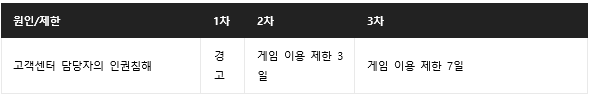 10.2 상담원 인권침해에 따른 이용 제한 1) 고객이 당사 고객 서비스 담당자의 인권을 침해하는 경우 고객은 다음과 같이 당사 서비스 이용이 제한될 수 있습니다. ※ 운영정책에 위배되지 않는 내용으로 문의를 접수하시면 다시 답변을 받으실 수 있습니다. ※ 3차 제재 이후에도 욕설, 성희롱, 인신공격, 협박성 표현이 반복될 경우 최대 30일까지 누적 게임 이용 제한이 적용될 수 있습니다. 2) 고객이 인권을 심각하게 침해한 경우 사전 통지 없이 계정이 영구적으로 제한될 수 있습니다. 아래 범주는 심각한 침해로 간주됩니다. • a. 욕설, 모욕, 서비스 담당자의 특정 신체 부위를 이용한 욕설 • b. 서비스 담당자와의 비공개 면담을 요구하거나 음란한 농담이 포함된 언어 및 행동을 사용하는 경우 • c. 서비스 담당자의 가족을 대상으로 한 성적 표현, 폭언 또는 욕설 • d. 서비스 담당자에게 성적 수치심을 줄 수 있는 사진 등의 이미지 • e. 기타 서비스 담당자가 성적 혐오감이나 굴욕감을 느낄 수 있는 내용 ※ 동일한 IP 또는 동일한 디바이스로 접속한 여러 계정에서 욕설, 성희롱, 인격 침해가 발생할 경우 동일인에 의한 행위로 처리될 수 있습니다.