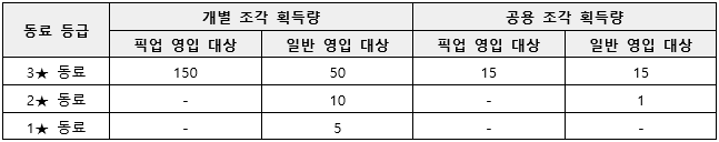 - 동료 중복 획득 시 조각 획득량은 아래 표를 참고 부탁드립니다.