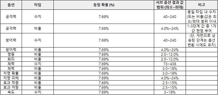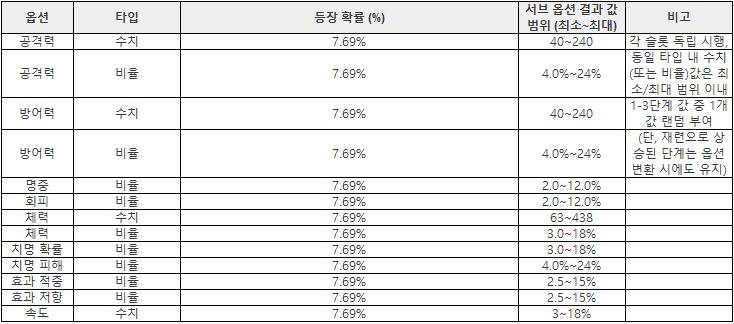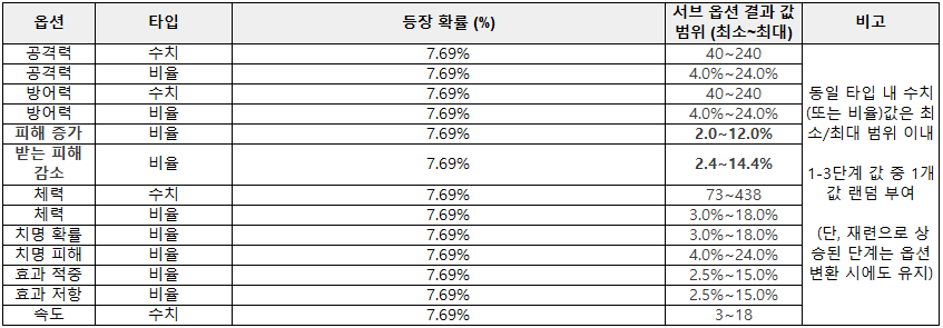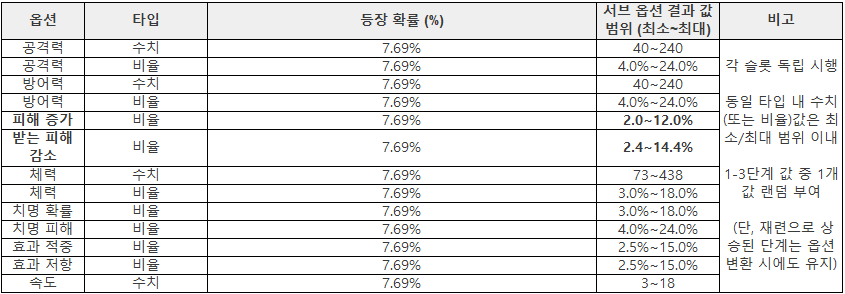 : 단, 메인 옵션으로 이미 사용 중인 옵션은 등장하지 않으며, 해당 옵션 등장 확률은 타 옵션 등장 확률에 균등 배분됩니다.