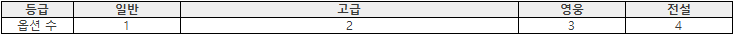 - 장비 등급 별 획득 시 초기 서브 옵션 수량은 아래와 같습니다.