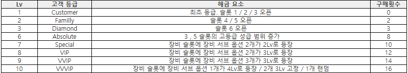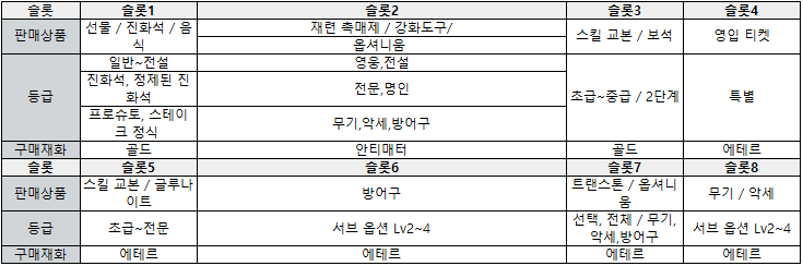 - 슬롯 별 판매 상품을 확인하실 수 있으며, 슬롯은 고객 등급에 따라 해금됩니다.